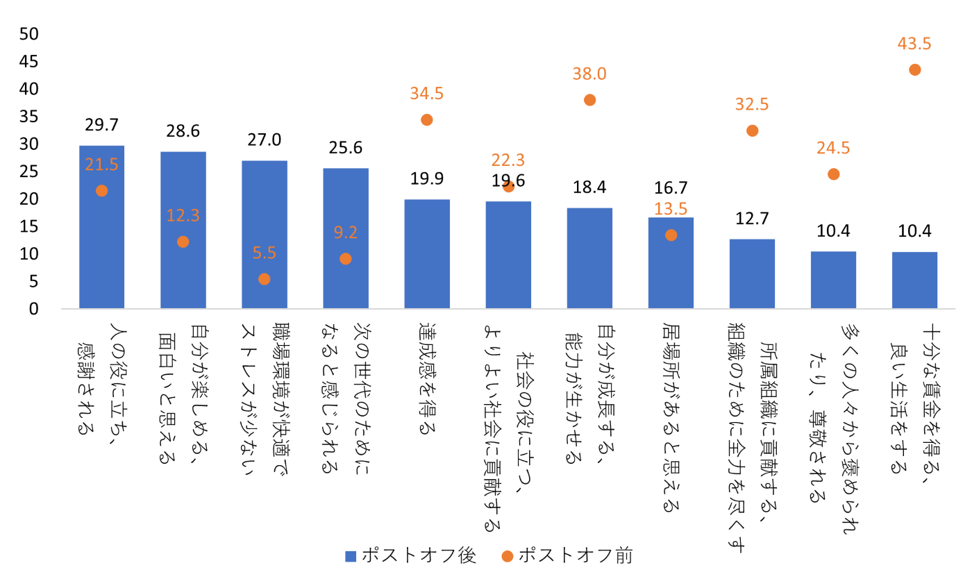 ミドルシニア期は、給与や役職への期待を失いがちな葛藤の時期です。リクルートマネジメントソリューションズの調査では、「充分な賃金を得る・良い生活をする」を重要と考える人は、ポストオフ前は43.5%でしたが、ポストオフ後は10.4%と大幅に低下しています。多くの人がこの時期に、仕事に意義を感じなくなるという落ち込みを経験します。